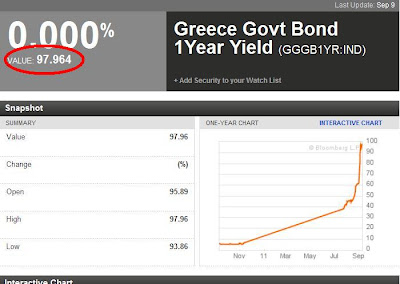 Et l’info du jour à 13h00: L’obligation grecque à 1 an est à …. 98%… de la faillite-domino (copie d’écran ci-dessous)
