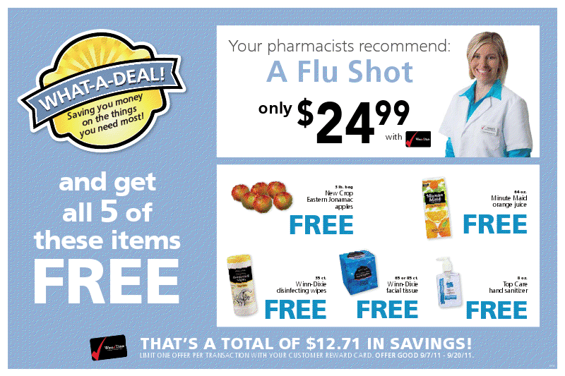 Et c’est reparti la promotion dans les grandes chaînes américaines pour vendre des vaccins contre la grippe à la population. Winn Dixie offre un vaccin contre la grippe pour 24,99$ et vous obtenez une des cinq produits de votre choix.