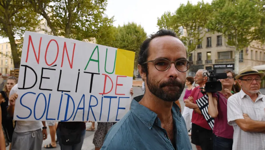 Je cite : » l’agriculteur français Cédric Herrou se tient devant le palais de justice d’Aix-en-Provence près d’une pancarte “Non au crime de solidarité” lors de son procès pour assistance illégale aux migrants. »